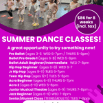 We are now accepting registrations for our 8 week summer sessions…a great opportunity to try a new type of dance or to brush up on skills! More classes may be added based on demand.